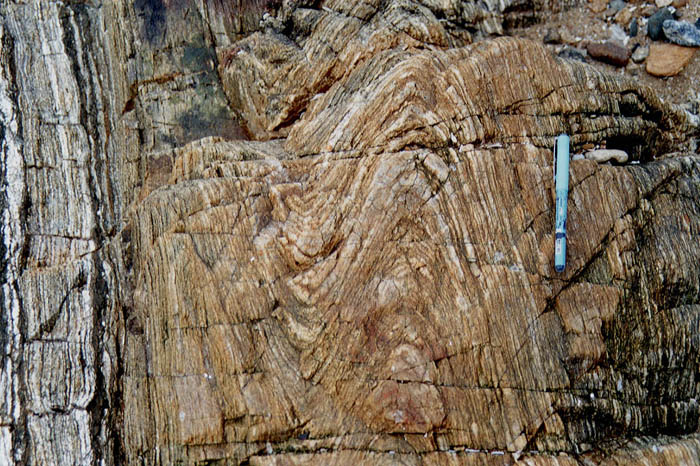 ¢º ÈñǪ¸¥ »ö°ú ¹àÀº »öÀÇ ¾Ï¼®ÀÌ ±³È£ÇÏ´Â º¯¼º¾Ï·ù. ¢º ¹àÀº »öÀÇ º¯¼º¾Ï·ù(¼®¿µ-Àå¼®Áú¾Ï)¿¡ ¹ß´ÞµÈ ±¸ºÎ·¯Áø ±¸Á¶(½À°î)°¡ º¸À̴µ¥ ½À°îÀÇ ÃàÀÌ °ÅÀÇ ¼öÁ÷ÀÓÀ» ¾Ë ¼ö ÀÖ´Ù. ¢º ¿·À¸·Î À̵¿ÇÏ¸é¼ ÁÙ¹«´Ì ±¸Á¶ÀÇ º¯È¸¦ °üÂûÇØ º¸ÀÚ. |